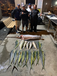Had Russ, Chris, Mark, back with buddy Rich. Started out on the tuna grounds, very slow to start, decided to make a run and worked out great for the crew. Landed a dozen mahi to 15lbs, then landed tiles to 25lbs, had the choice to go back for tuna or deep drop for swords, guys wanted some sword steaks, made a drop 15 minutes later we were tight and landed a nice 200lb sword! First NJ daytime sword for the Toy! And the beat goes on!